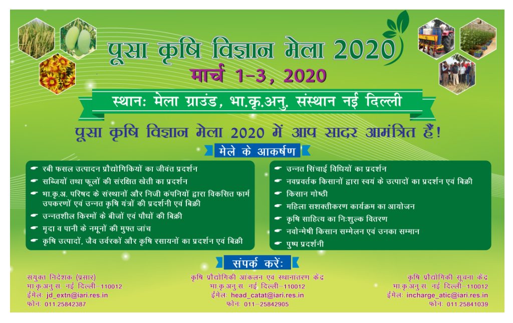 केंद्र सरकार आगामी 01 मार्च से 03 मार्च तक भारतीय कृषि अनुसंधान संस्थान परिसर, नई दिल्ली में कृषि विज्ञान मेले का आयोजन करने जा रही है। इस मेले में भारतीय कृषि अनुसंधान संस्थान के अलावा राज्य कृषि विश्वविद्यालय, भारतीय कृषि अनुसंधान परिषद के संस्थान, सार्वजनिक क्षेत्र के उपक्रम और गैर-सरकारी संगठनों के लोग भी शामिल होंगे। आपको बता दें कि इस मेले की शुरूआत 1972 से हुई थी। तब से हर साल इसका आयोजन होता आया है।