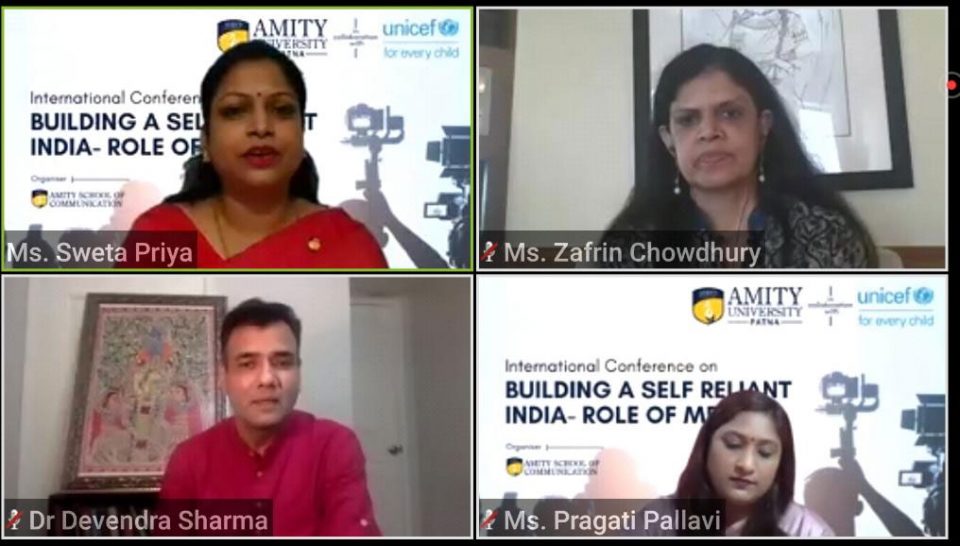 पटना 26 जुलाई 2020 : “आत्मनिर्भरता को सही अर्थों में समझने की ज़रूरत है. मीडियाकर्मियों द्वारा आम जनमानस के लिए इसकी सही व्याख्या नितांत आवश्यक है ताकि आत्मनिर्भर भारत के निर्माण को गति मिले.” द हिन्दू बिज़नेस लाइन के वरिष्ठ उपसंपादक श्री शिशिर सिन्हा ने युनिसेफ़ के सहयोग से एमिटी स्कूल ऑफ़ कम्युनिकेशन, एमिटी यूनिवर्सिटी, पटना द्वारा ‘बिल्डिंग ए सेल्फ़-रिलायंट इंडिया- रोल ऑफ़ मीडिया (अवेयरनेस, ट्रेंड्स, चैलेंजेज एंड प्रॉस्पेक्टस)’ विषय पर आयोजित दो दिवसीय अंतर्राष्ट्रीय वेबिनार में उक्त बातें कहीं.